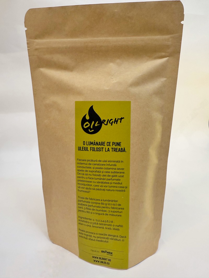 Conținutul este suficient pentru producerea a trei lumânări din propriul ulei uzat, acasă.